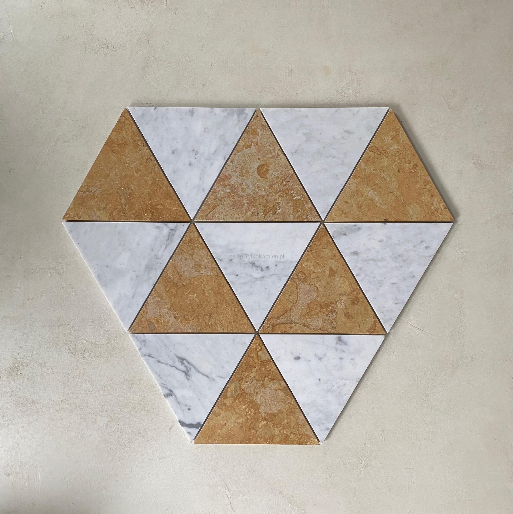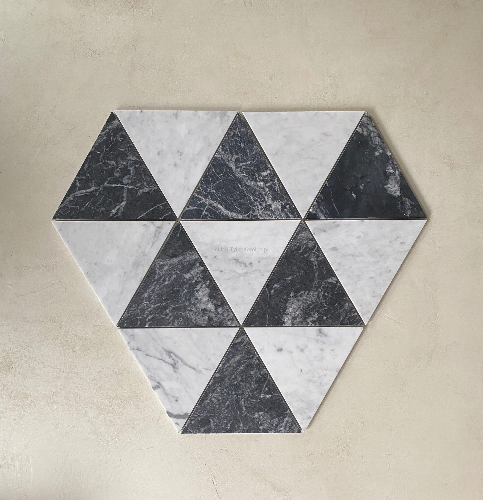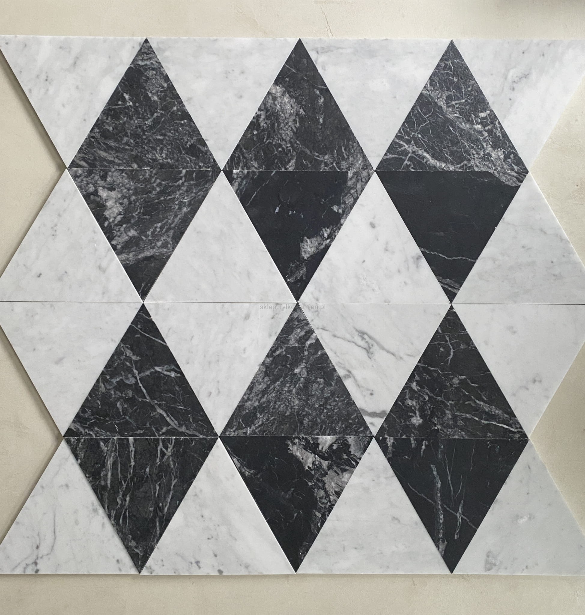 Diamond - kolekcja wyjątkowych płytek w kształcie trójkąta wyciętych z prawdziwego marmuru. Niesamowite, jedyne, niepowtarzalne. Możesz z nich stworzyć swój własny wzór mieszając kolory lub ułożyć 1 kolor a niebanalny kształt i tak zrobi efekt WOW! Wykończenie matowe, surowe cięcie. Na 1 m2 przypada 56 sztuk.