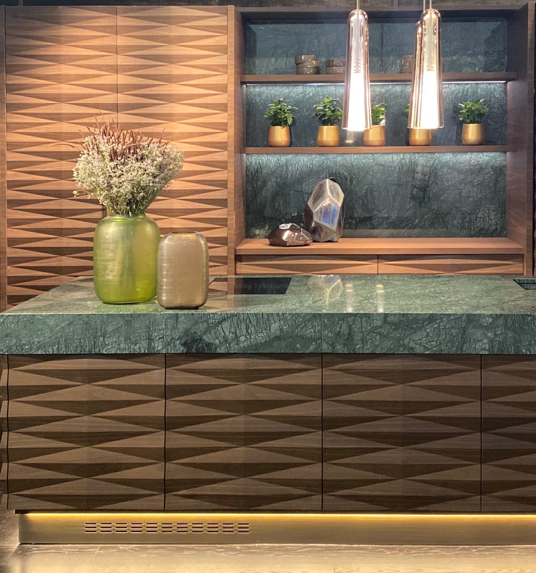 Klasyczny zielony marmur Verde Guatemala w dużej płycie. Prezentuje się bardzo elegancko.