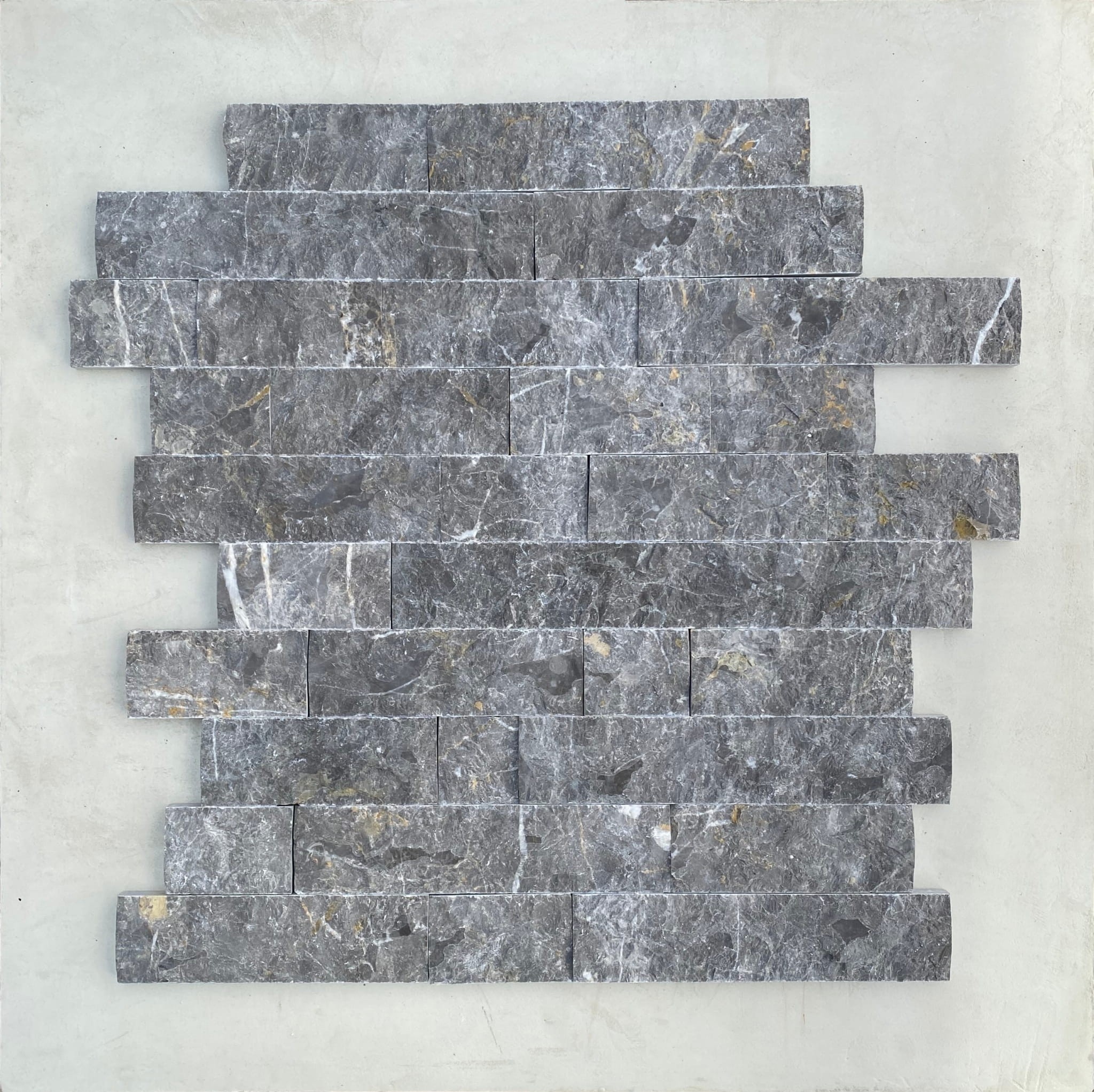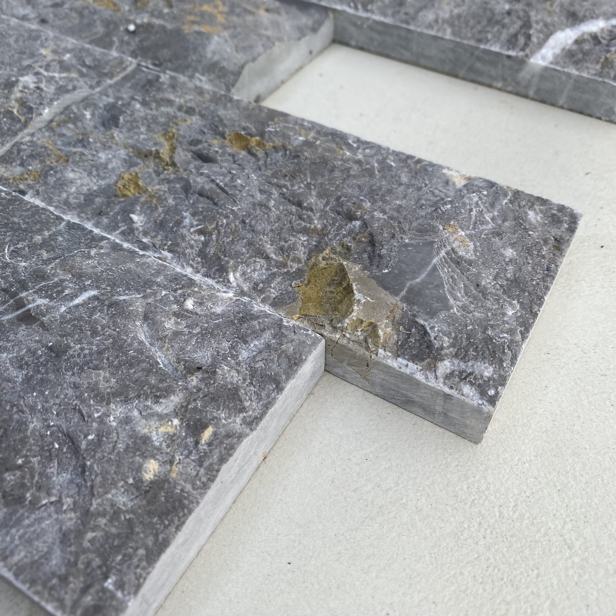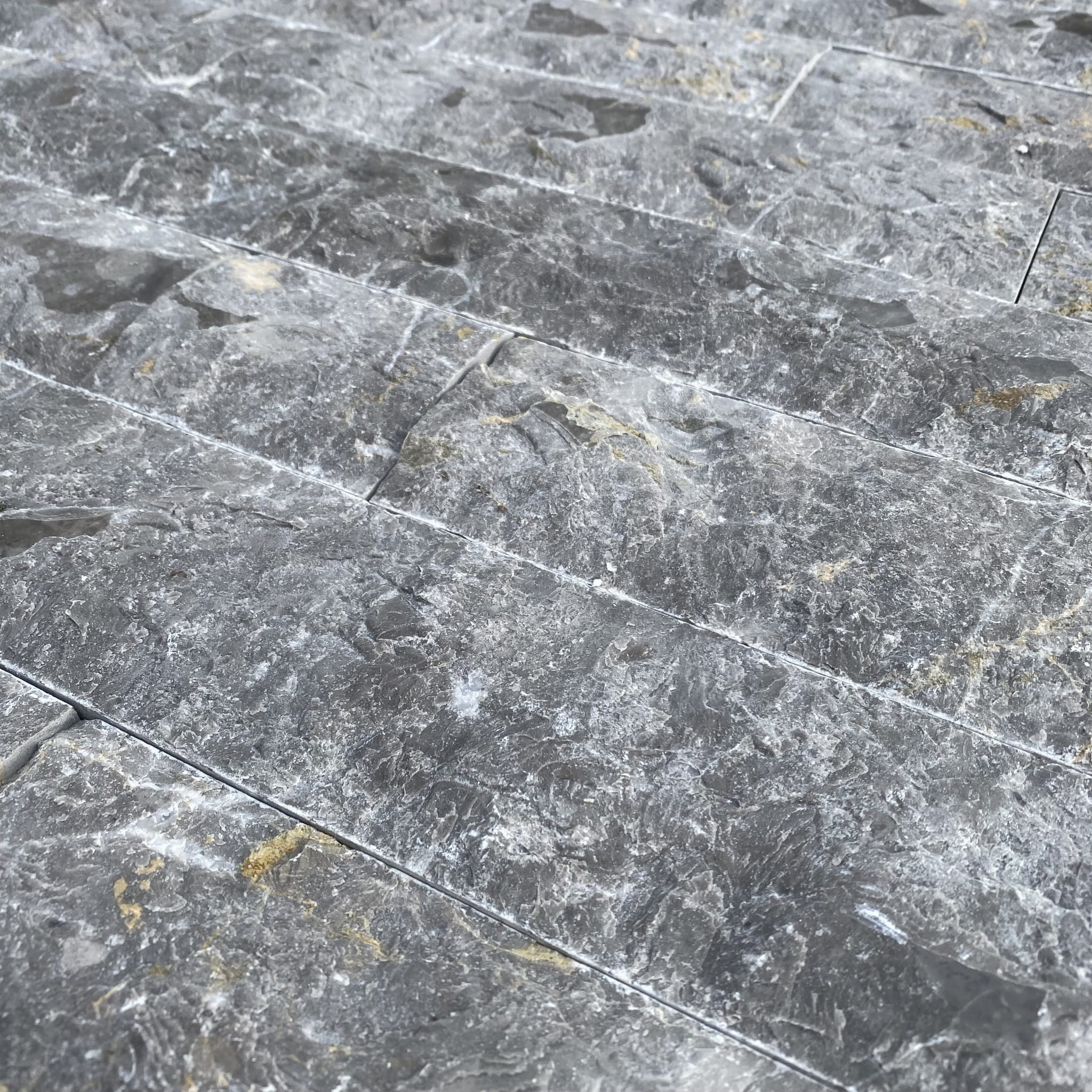 Płytki elewacyjne marmurowe w kolorze antracytowym z odrobiną złotożółtego.Mogą być również wykorzystane wewnątrz tworząc efektowną ścianę. Płytki są w różnych długościach, 7 cm szerokości, 2 cm grubości. Cena dotyczy 1 m2 (pakowane w kosz paletowy zwierający 23 m2).